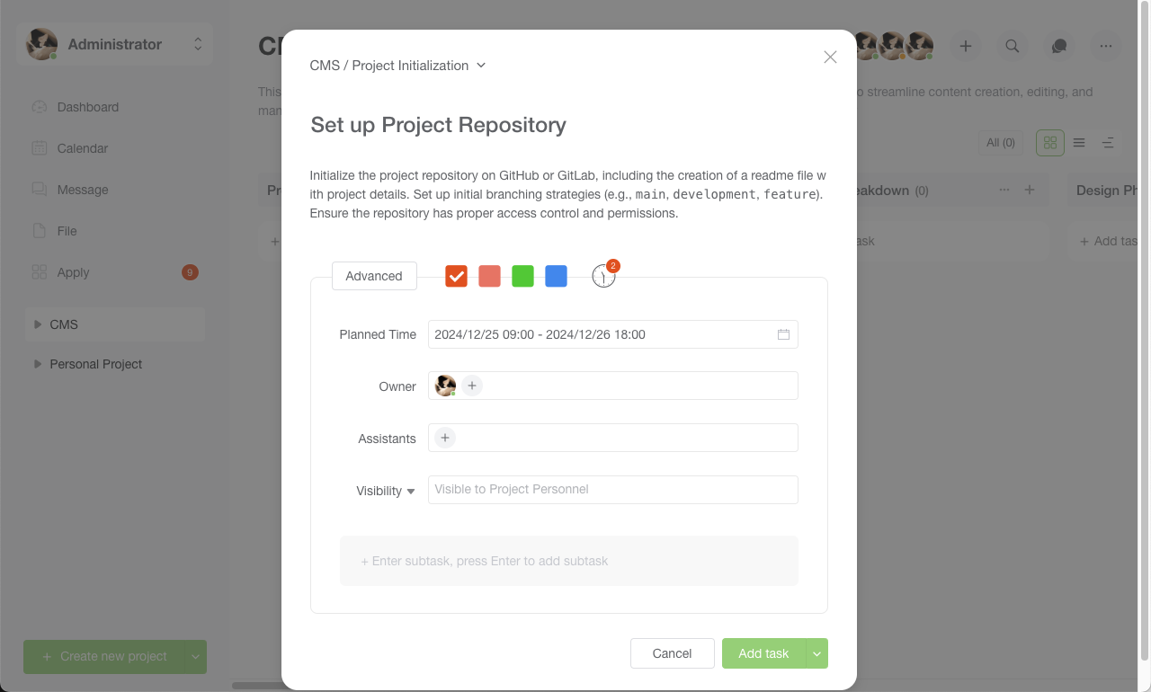 - Fill in task title, description, priority, time, collaborators, subtasks, and other detailed information.