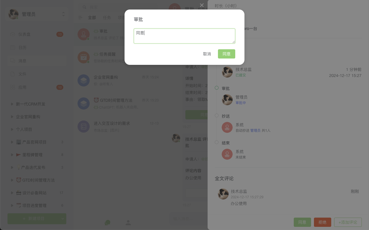 被授权的管理员或审批人可以对待审批的申请做出决策。审批人可以选择点击右下角的【同意】或【拒绝】按钮,快速处理申请: