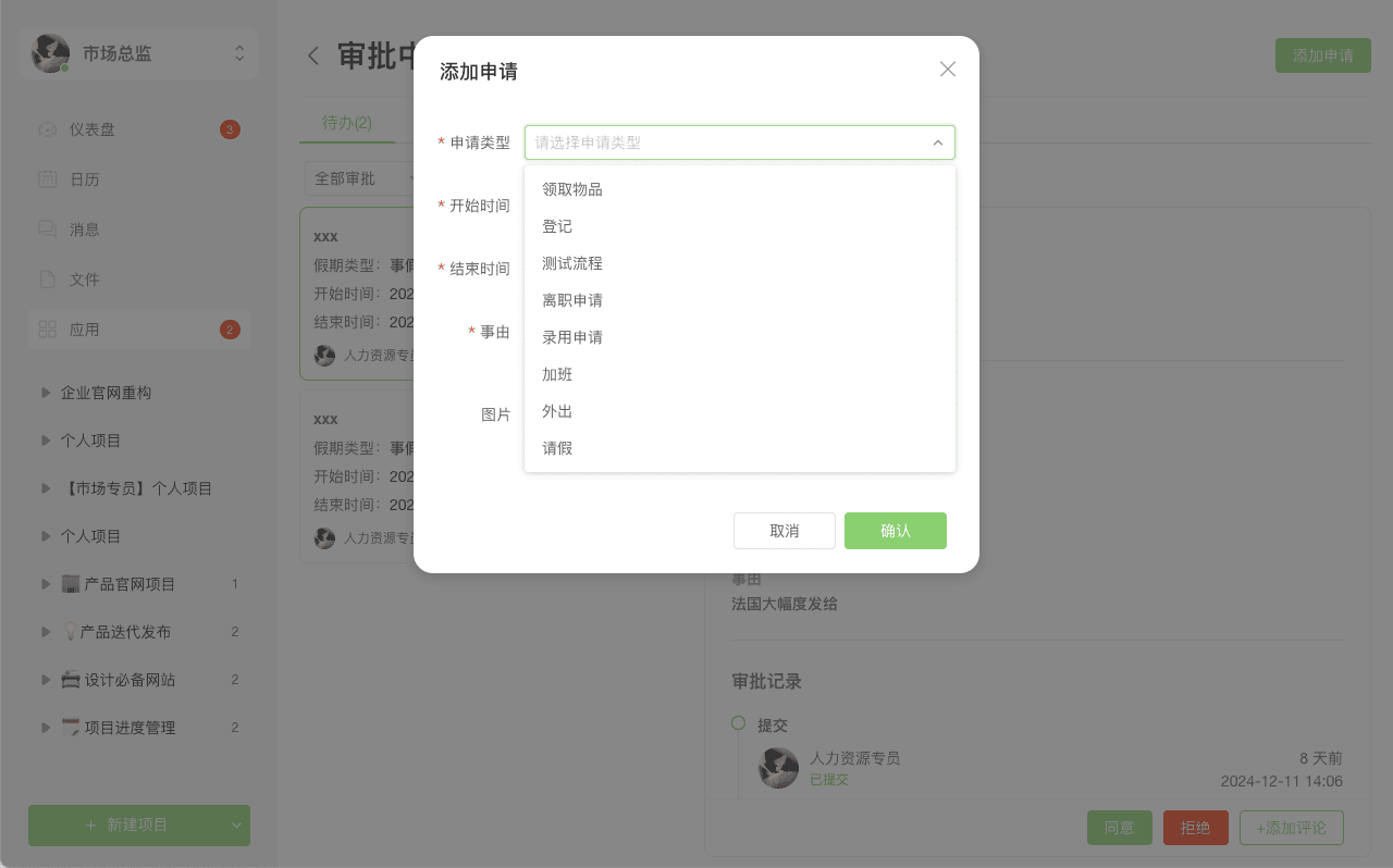提交审批功能,提供便捷的申请与审批流程,用户可以在应用的审批中心进行管理和跟踪。