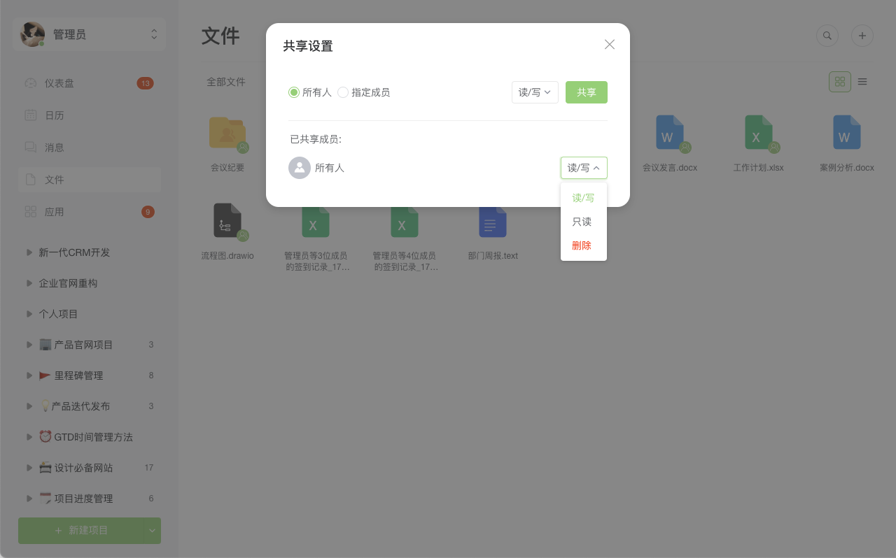 - 共享范围:可选择将文件或文件夹共享给“指定成员”或“所有人”。