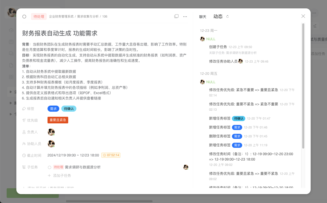- 填写任务标题、描述、优先级、时间、协作人员、子任务等详细信息。